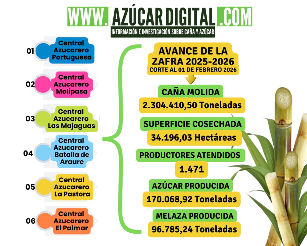 Las cifras manejadas por la Corporación Venezolana del Azúcar (CVA-Azúcar) con fecha de corte al 1ero de febrero 2026, indican que, producto de la constancia de los seis centrales azucareros operativos en este momento en el país, se ha alcanzado la molienda de 2 millones 304 mil 410, 50 toneladas de caña de azúcar, con un rendimiento promedio de 67 toneladas por hectárea, provenientes de 34 mil 196.03 hectáreas cosechadas de un universo de mil 471 productores.